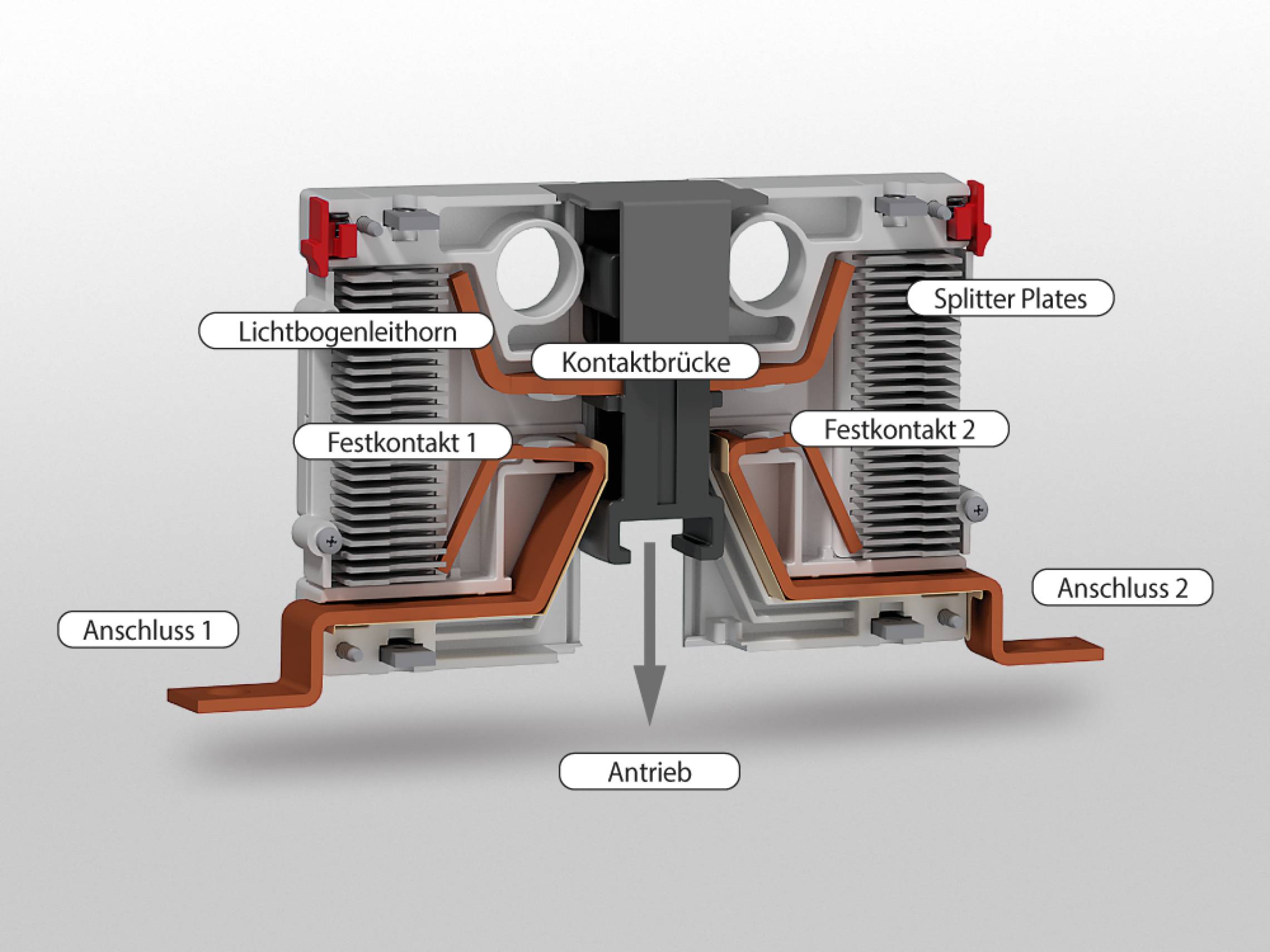 In the presence of high currents and voltages, the ionisation threshold of air can be exceeded due to the high current density at the contact point when switching occurs. A plasma (a gas comprising ionised air molecules and free electrons) is then formed between the contact points. The formation of this switching arc has two key consequences: Firstly, despite open contacts, current continues to flow because the plasma has a high electrical conductivity. Secondly, very high temperatures of up to 20,000 K occur, easily capable of causing damage to the contacts of the contactor, as well as to the surrounding system components. Due to the zero crossing of the voltage which, at a mains frequency of 50 Hz, occurs no more than 20 milliseconds later, this can be quenched in a relatively simple manner. However, problems arise in switching inductive loads because now the voltage and current are no longer in phase. Whatever the case, where there are high-energy electric arcs associated with relatively high voltages and currents, damage to the contactor or the entire system can occur. Therefore, various measures must be implemented to counteract this.